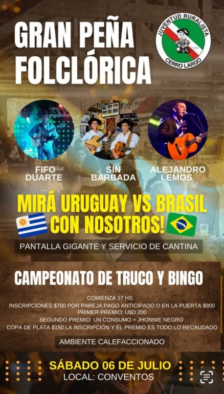 Habrá campeonato de truco, bingo, servicio de cantina  y pantalla gigante para luego presenciar el partido de Uruguay – Brasil.